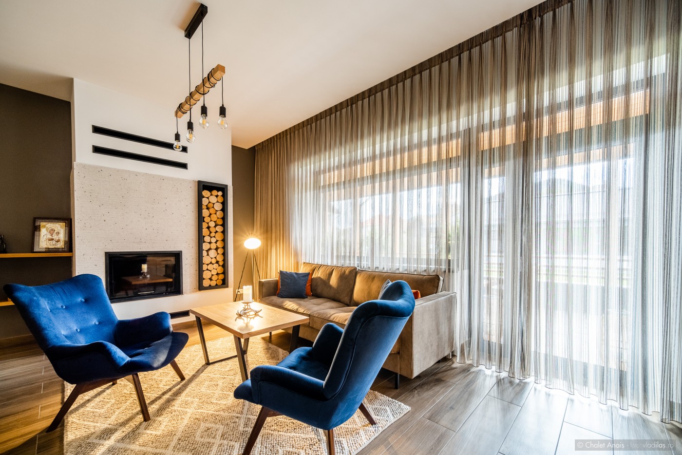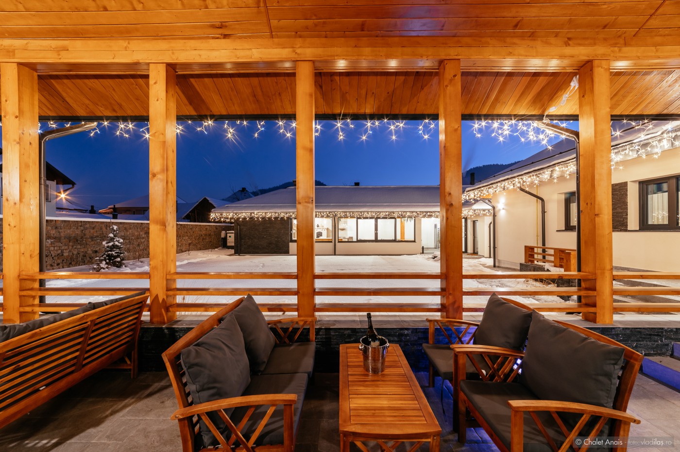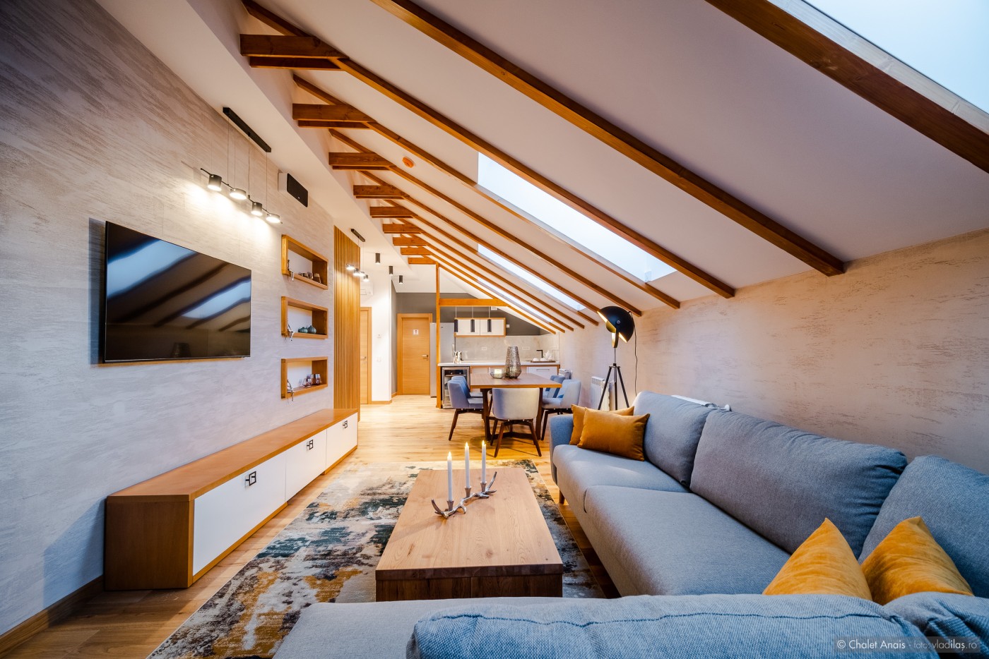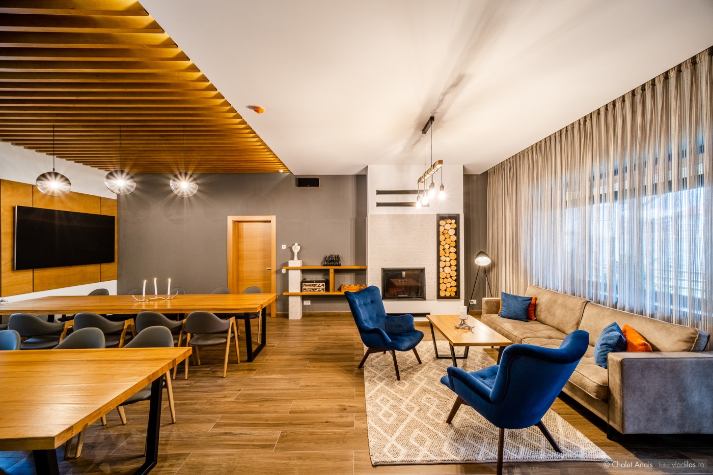 Anais Chalet este locul perfect pentru o vacanță liniștită și relaxantă, departe de agitația orașului și de stresul cotidian. Pensiunea este foarte chic, cu un living deosebit de spațios, cu loc de luat masa și șemineu.